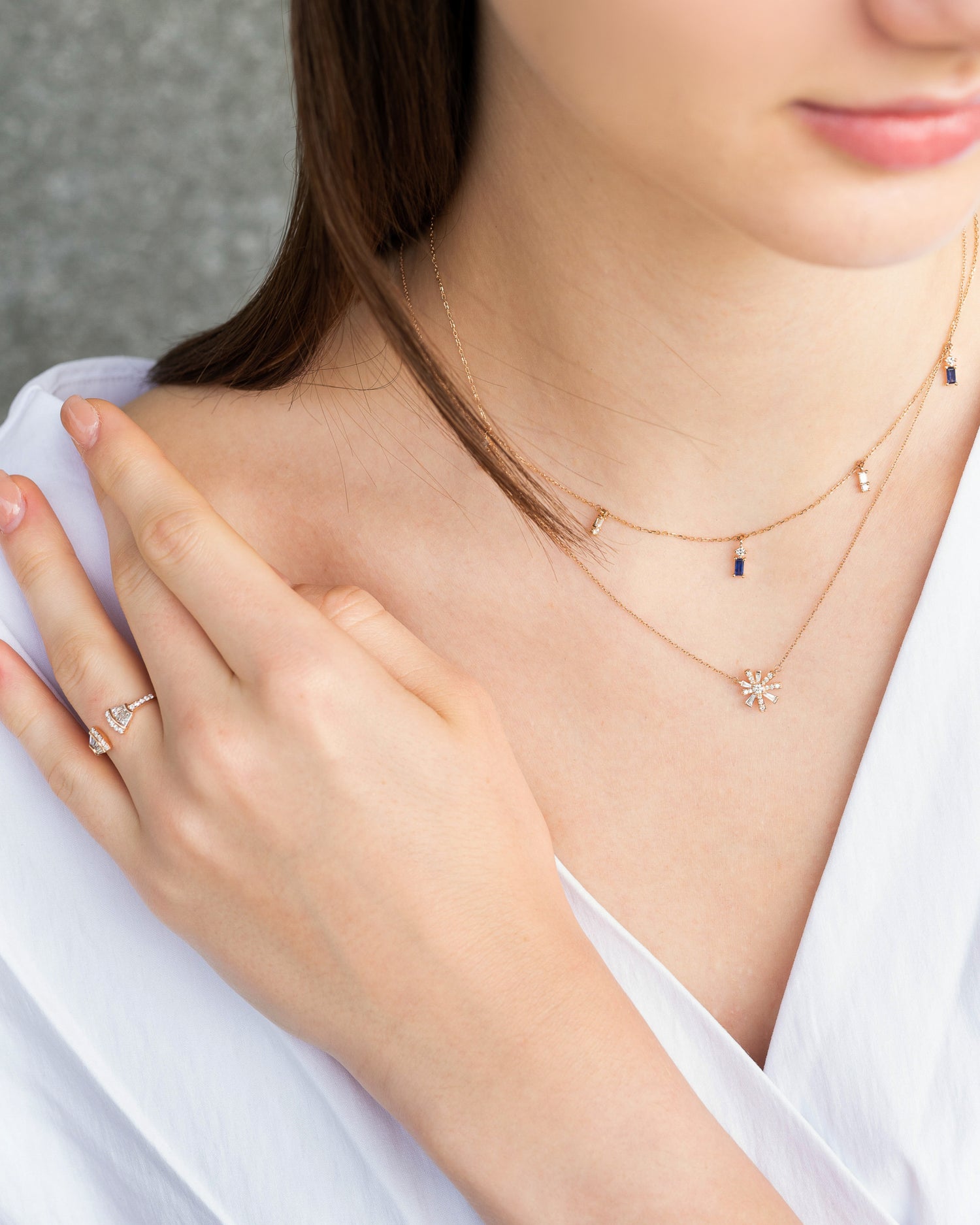 長方彩色寶石及鑽石排列,時髦點綴於頸部,營造出復古的氛圍